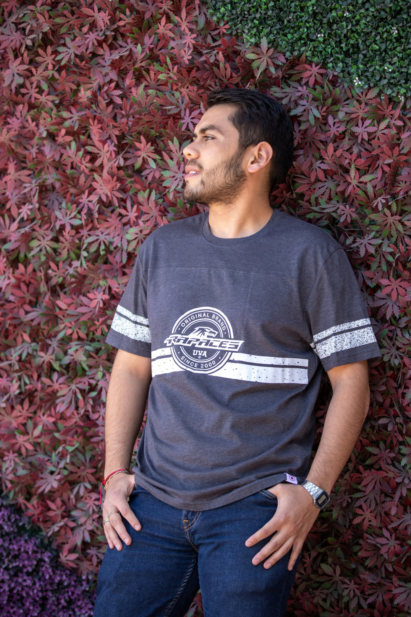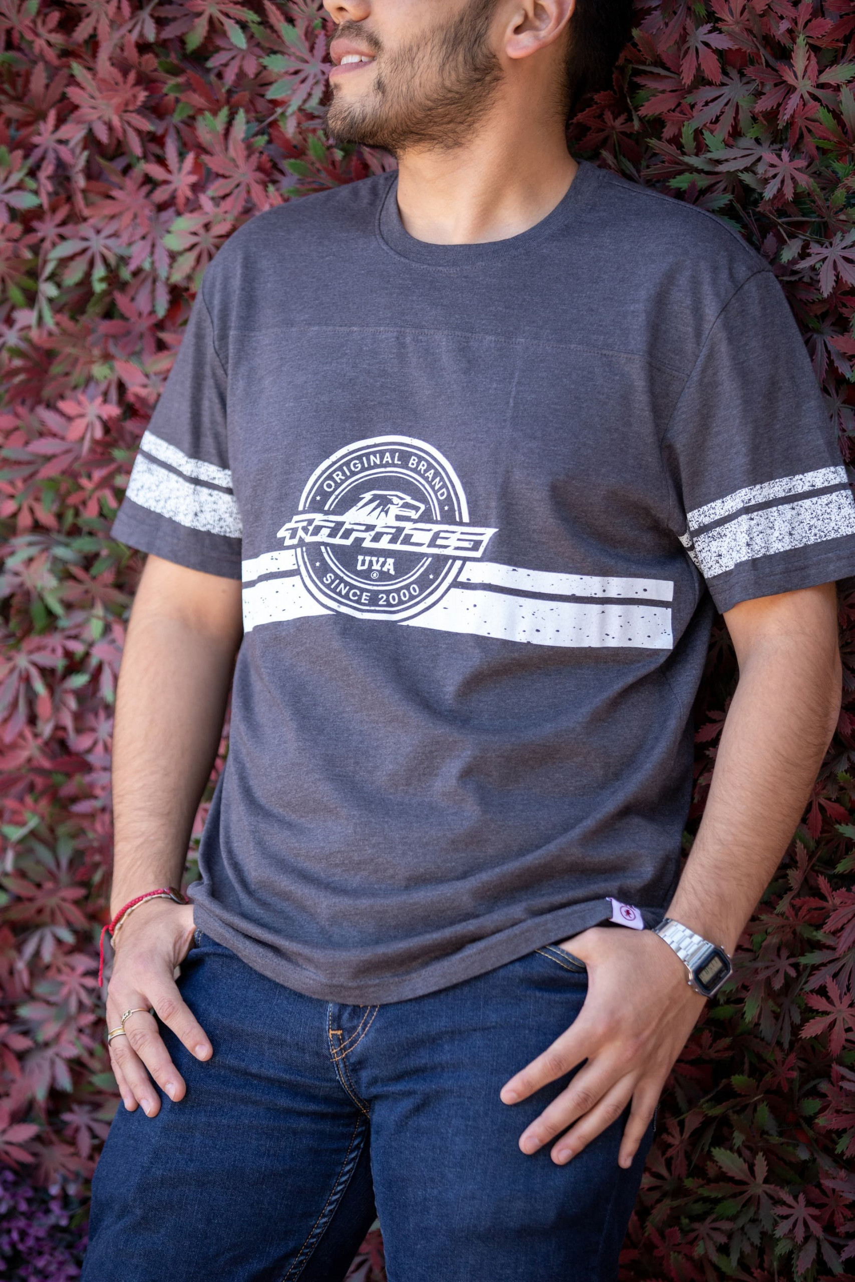4.5 onzas, 60/40 algodón/poliéster hilado en anillo peinado, 32 individuales. Hombro caído con manga más larga. Rayas estampadas desgastadas en la manga. Cuello del mismo tejido. Canesú delantero y trasero. Dobladillo curvo.